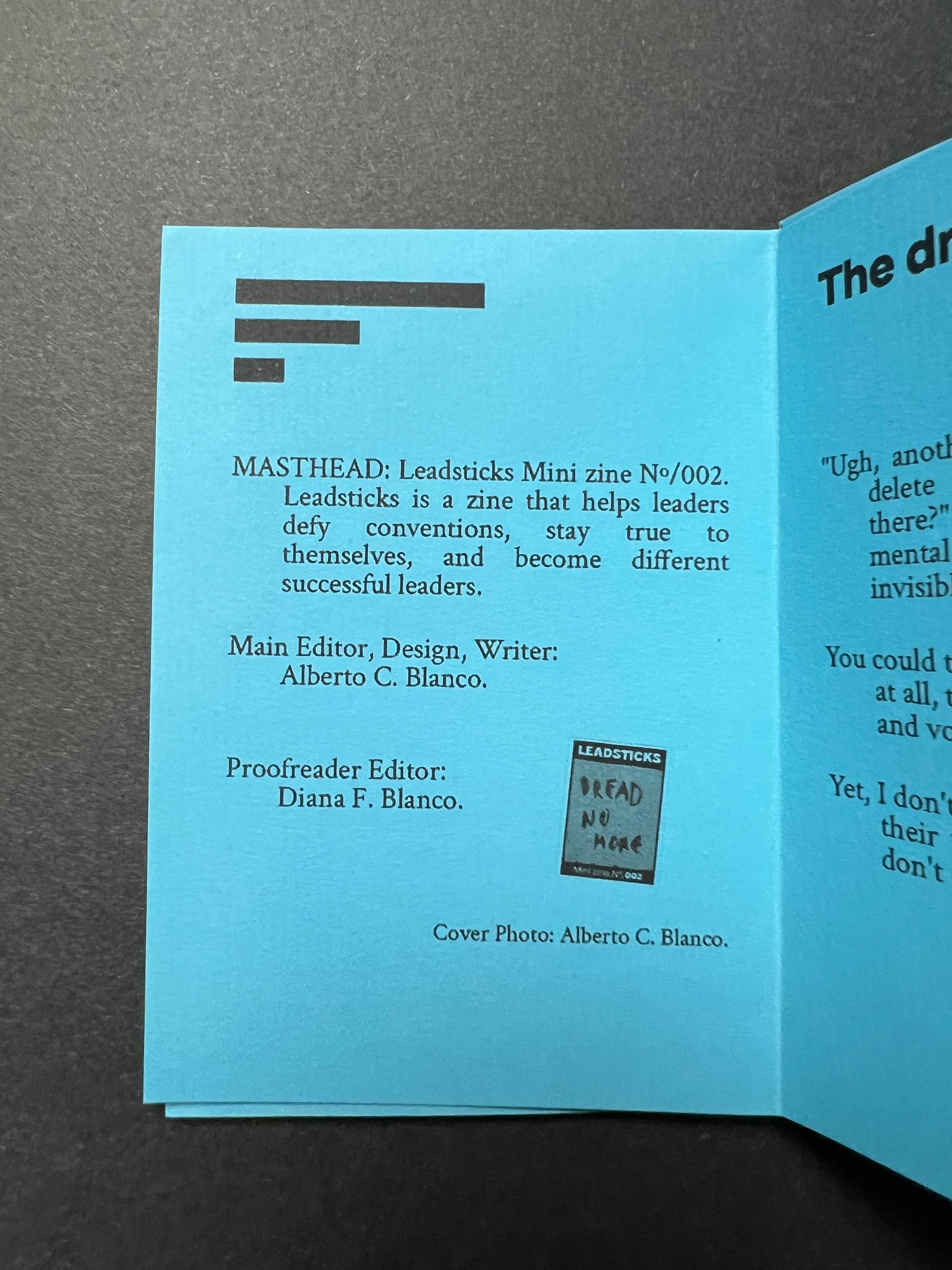 Leadsticks mini zine Nº/002. Front angle.
