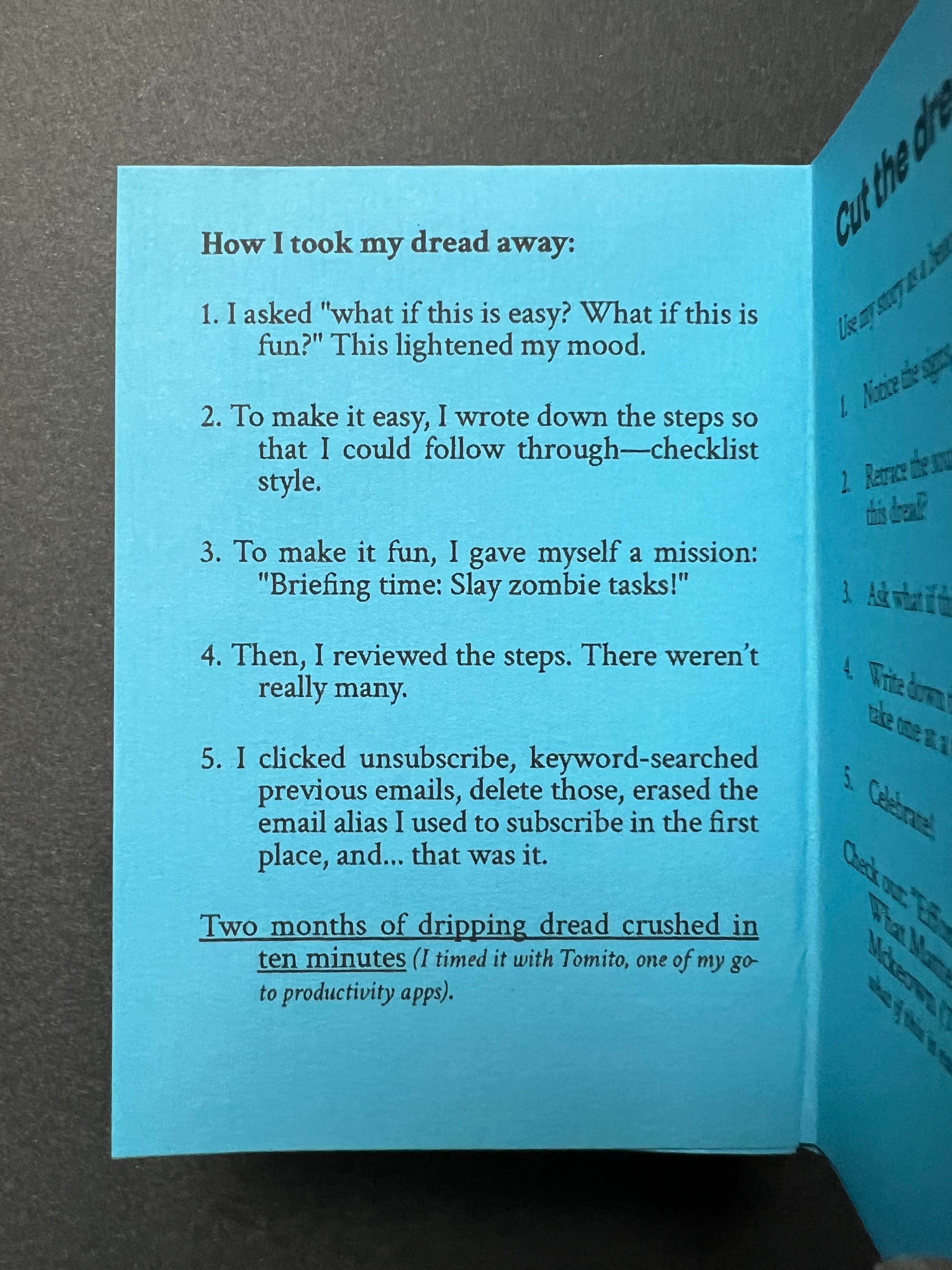 Two months of dripping dread crushed in ten minutes (I timed it with Tomito, one of my go-to productivity apps).